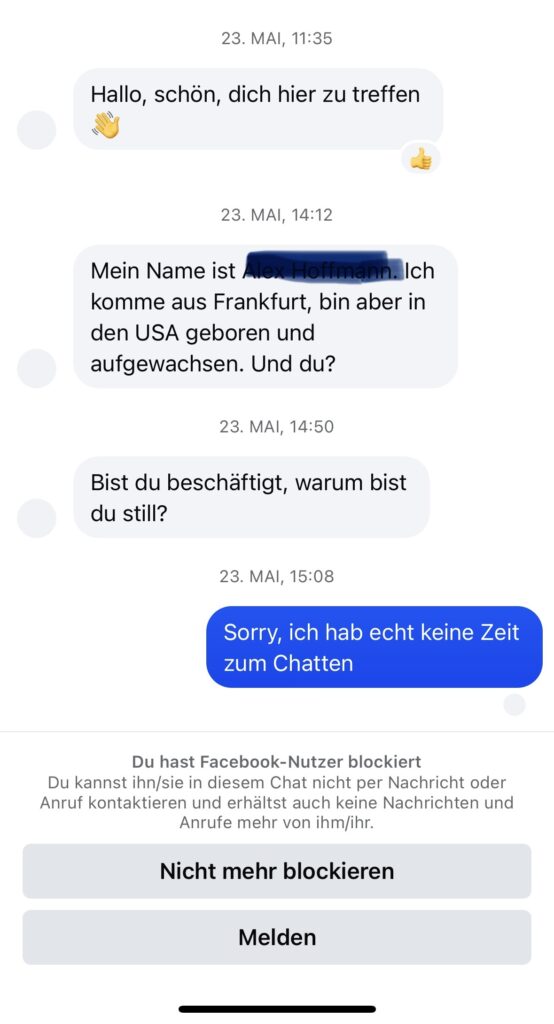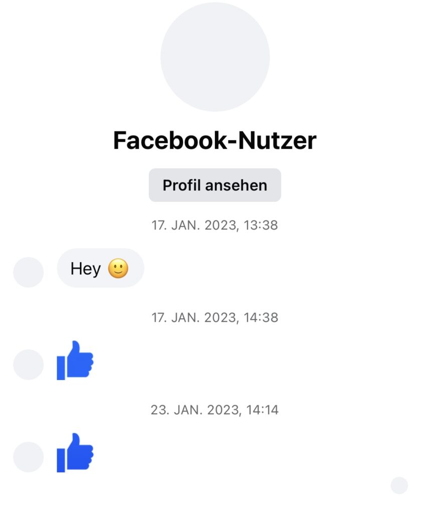 Eine falsche Identität, die vorgibt, mich zu kennen? Gruselig! Wäre er ein echter Bekannter, müsste er sich nicht so kryptisch anpirschen. Mein Resümme: Das alles sind Energievampire, die ihrer Fadesse entkommen wollen, indem sie möglichst vielen Menschen so richtig auf die Nerven gehen.