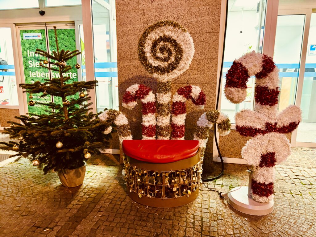 Hier siehst du ein Musterbeispiel für stimmungsvolle Weihnachtsdeko aus meiner Heimatstadt. Obwohl – auch dieses Bild der Harmonie (von 2024) demonstriert eine Schattenseite. Inzwischen haben Gauner einen Geldautomaten im Bankfoyer dahinter gesprengt. Darum ist das Licht zurzeit aus.