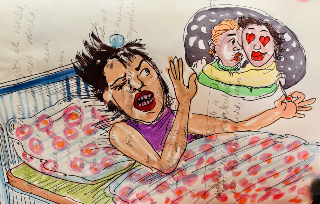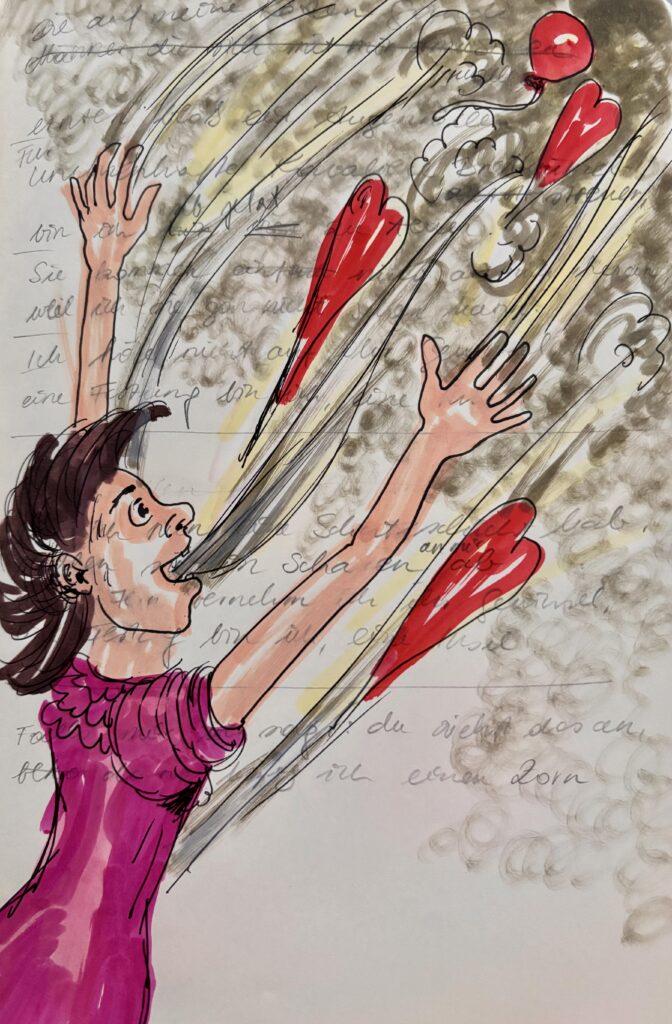 Und zwar den alltäglichen Ärger über ganz normale Blödheiten. Mir zeigte mal eine Halbfremde im Straßenverkehr zornig den Finger, weil meine damals 12-jährige Beifahrerin die Autotür gefährlich weit aufgerissen hatte. Tagelang ärgerte ich mich über die Geste so sehr, dass ich dieses Bild zeichnete.