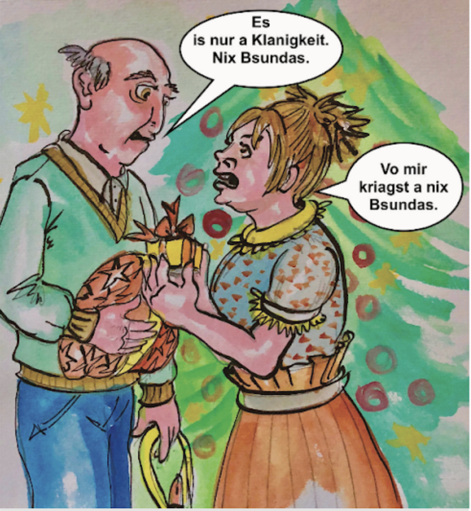Auch wenn sich diese Beschenkte offensichtlich freut, so sagt sie, wenn sie sich an das Rollenspiel hält, mit ihrem Satz „Das wär doch nicht nötig gewesen“, dass sie das Geschenk eigentlich nicht brauche. Der Schenker wertet das Präsent mit der Phrase „is jo nur a Klanigkeit“ ab.