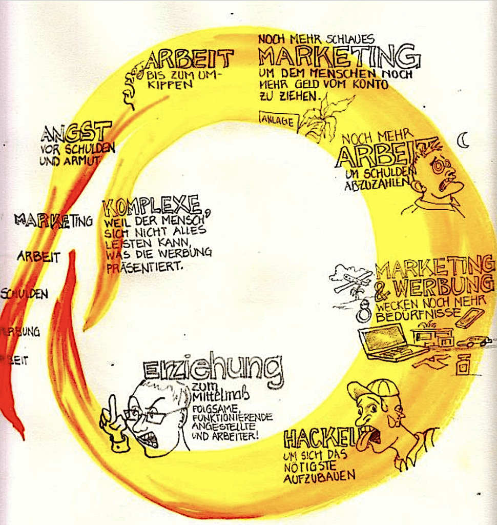 Der Teufelskreis des Verarschens beginnt mit Sozialisierung zum hörigen Dienstnehmer und willfährigen Konsumenten. Das muss so sein, sonst funktioniert das System nicht. Das gesamte Leben ist von Bestrebungen, ein noch kaufkräftigerer Konsument zu werden, bestimmt. Existenzangst ist eine gute Motivation, sich hier einspannen zu lassen. (Start bei „Erziehung“)
