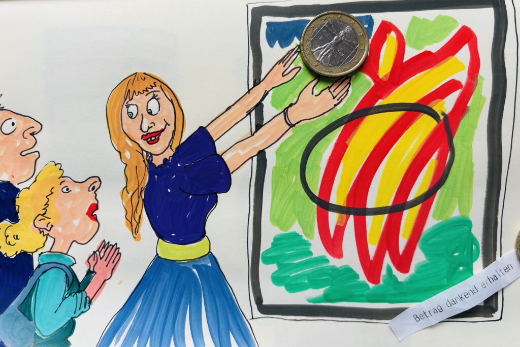 Wer kommt denn überhaupt in so eine Galerie, um einen Blick auf die vermieteten Wände zu werfen? Vermutlich vor allem Freunde, Bekannte und Verwandte der kunstschaffenden Person, welche auch für die Einladungskarten geblecht hat. Und kauft einer von denen ein Bild, kassiert die „Galerie“ dann die Provision?