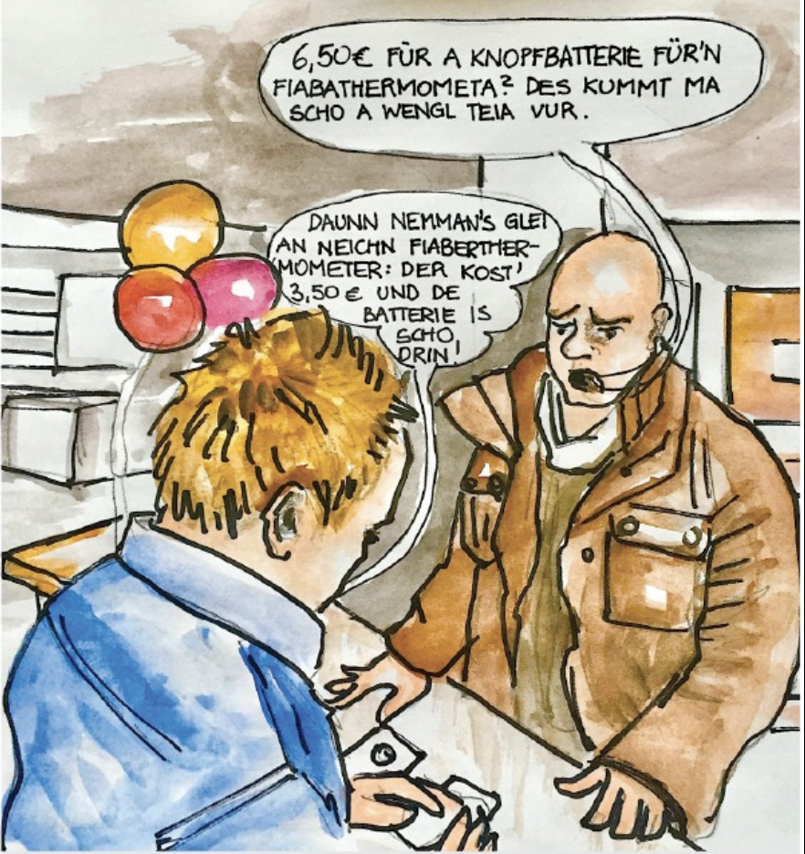 Wenn eine Batterie teurer ist als das ganze Gerät inklusive Batterie: Die Leute zu verarschen ist bei der Preisgestaltung ganz normal. Eine tatsächlich beobachtete Szene.